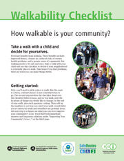 How walkable is your community? The Walkability Checklist can help you find the answer. Inside you'll find insightful questions, allowing you to evaluate your neighborhood's walkability. In addition to the questions, the Checklist provides both immediate answers and long-term solutions to your neighborhood's potential problems. Pick a place to walk, like the route to school or a friend's house. As you walk, use the checklist to describe problem areas and things to change. After the walk, answer all of the questions and you'll see how your route rates on the walkability scale. Take heart if you find problems, there are many ways you can make things better.