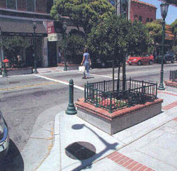 A woman crosses at a midblock bulb-out.