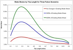 Based on suggestions and feedback from the PBAC, several mode share scenarios were modeled. This was done in order to develop a forecasting range that would take into consideration future changes in land use patterns, population and employment densities, commuting behaviors, and environmental, social, and economic factors.