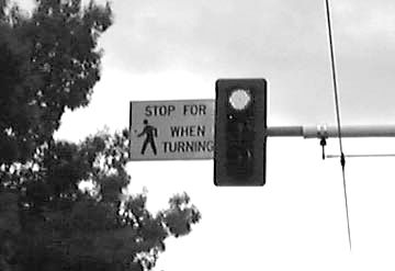This experimental sign instructs drivers to yield to pedestrians when turning at this intersection.
